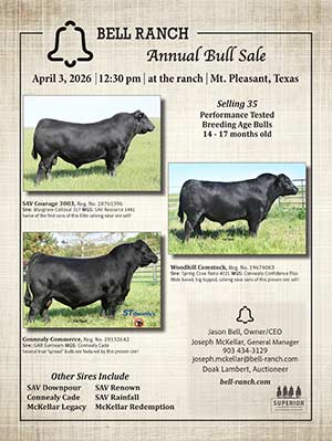 Bell Ranch, originally established in 1847, is located in the fertile rolling hills of Northeast Texas, in Titus County near Mt. Pleasant. Our registered Angus cattle herd is managed in an efficient manner on spacious mixed grass pastures. The Bell Ranch breeding program prioritizes fertility, calving ease, growth, maternal ability and carcass traits. This is accomplished while maintaining muscle shape, structural correctness, foot shape and overall fleshing ability in a visually attractive package. Bell Ranch cattle are bred and developed for profitability - producing real-world performance and value for our customers. Thank you for your interest in our program.